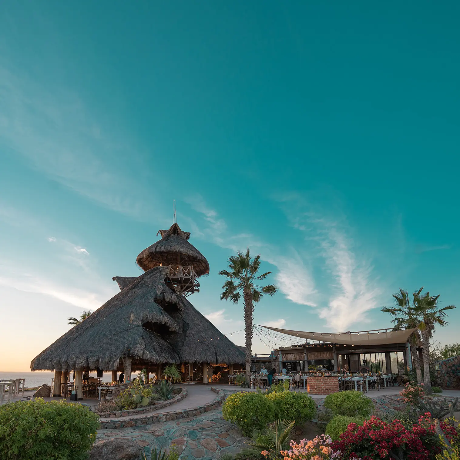 Alta cocina con ingredientes del mar y del desierto, servida frente al atardecer más inolvidable de Todos Santos.